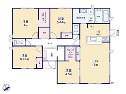 | 間取り | 4LDK(4LDK+ウォークインクローゼット) 間取り内訳:リビングダイニングキッチン 16帖(1階)・洋室 7帖(1階)・洋室 5.4帖(1階)・洋室 5.4帖(1階)・洋室 4.5帖(1階) |