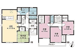 | 間取り | 4LDK 間取り内訳:リビングダイニングキッチン 15帖(1階)・和室 4.5畳(1階)・洋室 7.5帖(2階)x2・洋室 6帖(2階) |