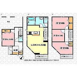 | 間取り | 4LDK 間取り内訳:洋室 5.2帖(1階)・リビングダイニングキッチン 14.2帖(1階)・洋室 6帖(3階)x2・洋室 4.5帖(3階) |