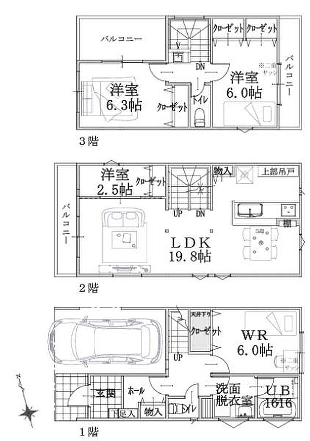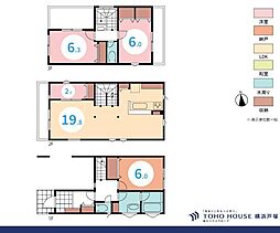 間取り内訳:洋室 6帖(1階)・洋室 2.5帖(2階)・リビングダイニングキッチン 19.8帖(2階)・洋室 6.3帖(3階)・洋室 6帖(3階)