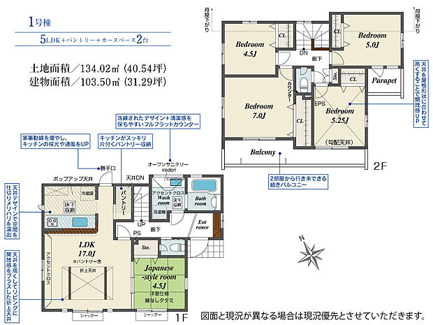 - 「建築条件付き土地」の「建物プラン例」は、土地購入者の設計プランの一例であり、プランの採用可否は任意です。