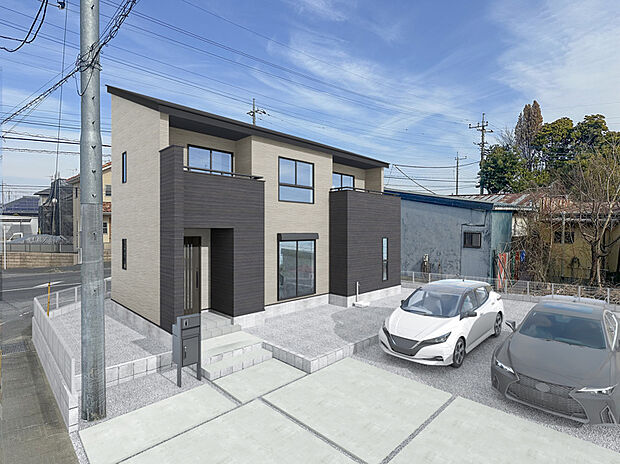 • 【【外観完成イメージ】】 ブラックの外壁は南側にのみ使用しており、見る角度で全く違った印象の外観デザインとなっております。※現地写真に完成イメージ画像を合成したものです。