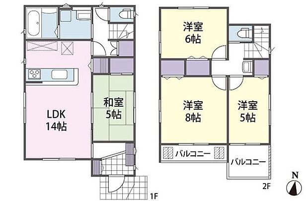 | 間取り | 4LDK 間取り内訳:リビングダイニングキッチン 14帖(1階)・洋室 8帖(2階)・洋室 5帖(2階)・和室 1畳(1階) |