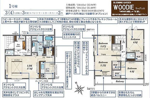 間取り内訳:リビングダイニングキッチン 17帖(1階)・洋室 6帖(2階)x2・洋室 11帖(2階)