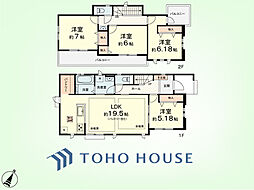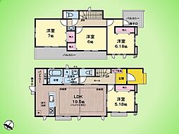 | 間取り | 4LDK 間取り内訳:リビングダイニングキッチン 19.5帖(1階)・洋室 5.1帖(1階)・洋室 7帖(2階)・洋室 6.1帖(2階)・洋室 6帖(2階) |