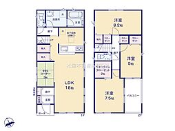間取り内訳:リビングダイニングキッチン 18帖(1階)・洋室 7.5帖(2階)・洋室 8.2帖(2階)・洋室 5帖(2階)