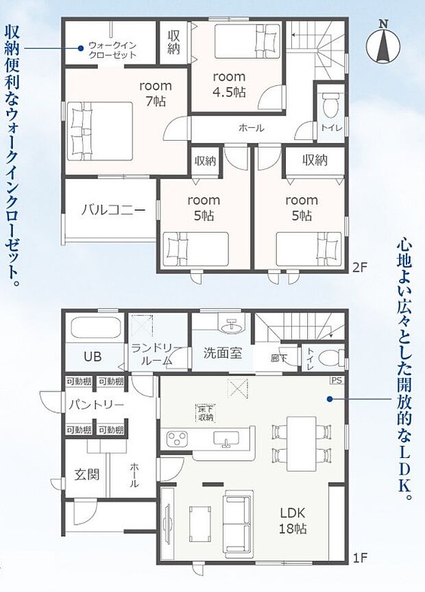 ◆家族が自然に集まる!広々リビング18帖♪キッチンがスッキリ!パントリー収納◎節水型トイレで家計に優しい♪洋服選びが楽しくなっちゃう♪ウォークインクローゼット付き◎南向き日当たり良好なバルコニー♪