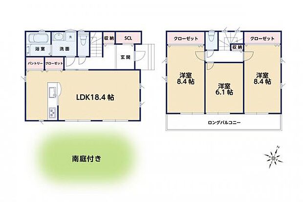| 間取り | 3LDK 間取り内訳:リビングダイニングキッチン 18.4帖(1階)・洋室 8.4帖(2階)x2・洋室 6.1帖(2階) |