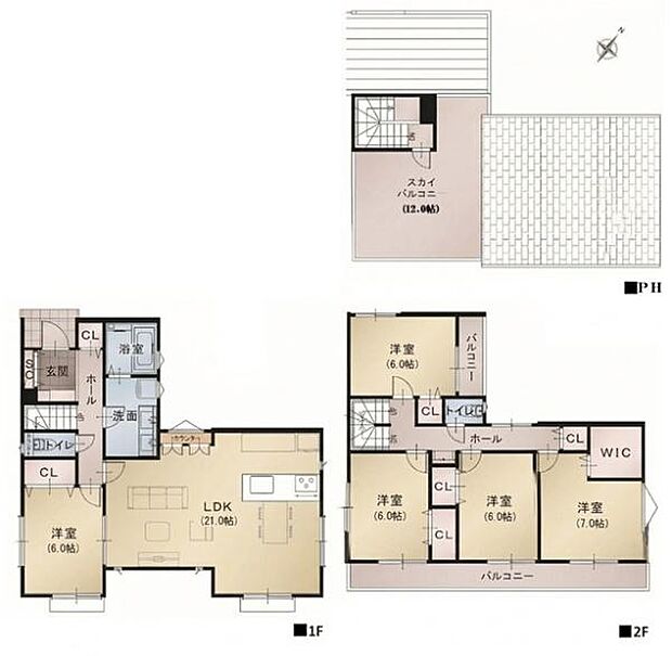 | 間取り | 5LDK 間取り内訳:リビングダイニングキッチン 21帖(1階)・洋室 6帖(1階)・洋室 7帖(2階)・洋室 6帖(2階)・洋室 6帖(2階)・洋室 6帖(2階) |