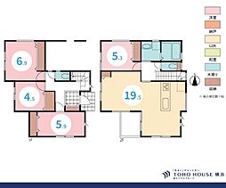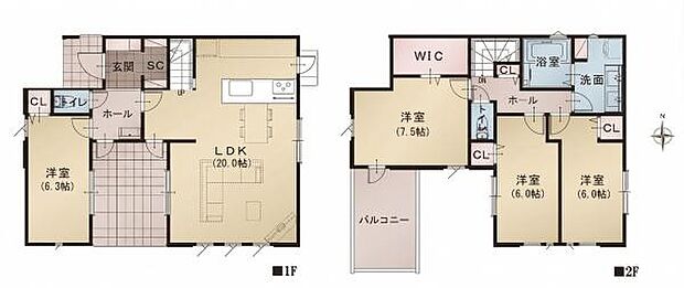 間取り内訳:リビングダイニングキッチン 20帖(1階)・洋室 6.3帖(1階)・洋室 7.5帖(2階)・洋室 6帖(2階)・洋室 6帖(2階)