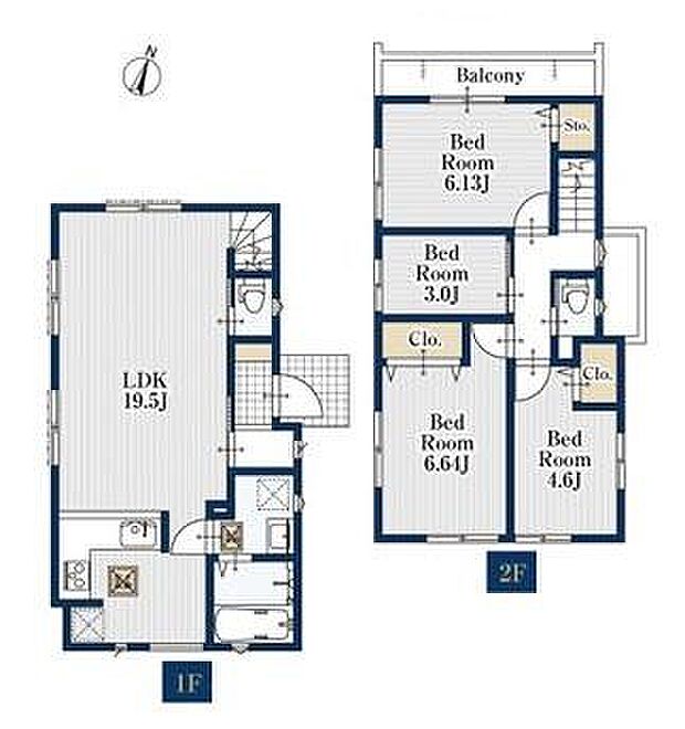 間取り内訳:リビングダイニングキッチン 19.5帖(1階)・洋室 6.1帖(2階)・洋室 6.6帖(2階)・洋室 4.6帖(2階)