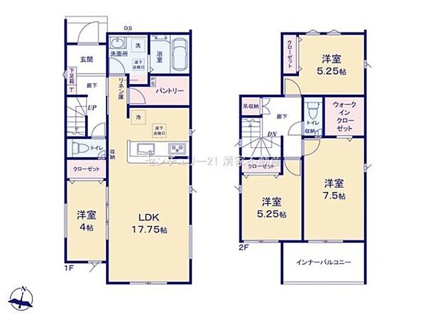 | 間取り | 4LDK 間取り内訳:リビングダイニングキッチン 17.7帖(1階)・洋室 4帖(1階)・洋室 7.5帖(2階)・洋室 5.2帖(2階)・洋室 5.2帖(2階) |