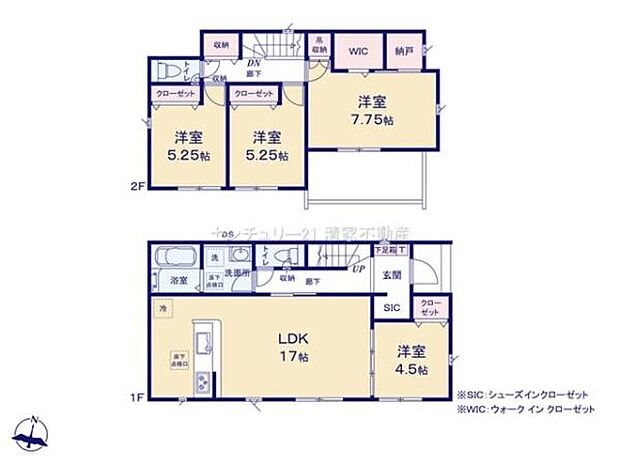 間取り内訳:リビングダイニングキッチン 17帖(1階)・洋室 4.5帖(1階)・洋室 7.7帖(2階)・洋室 5.2帖(2階)・洋室 5.2帖(2階)