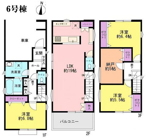 | 間取り | 3SLDK 間取り内訳:洋室 6.8帖(1階)・リビングダイニングキッチン 19帖(2階)・洋室 6.4帖(3階)・洋室 5.5帖(3階)・収納 5帖(3階) |