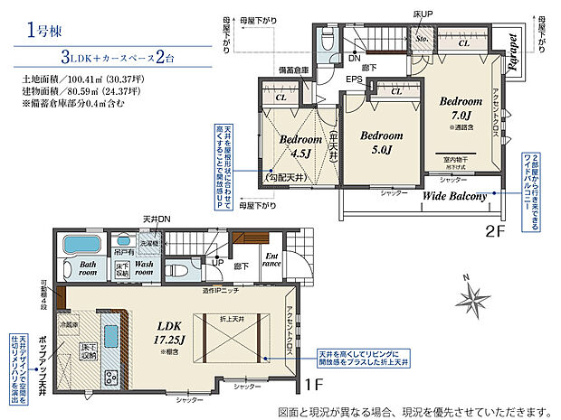 - 「建築条件付き土地」の「建物プラン例」は、土地購入者の設計プランの一例であり、プランの採用可否は任意です。