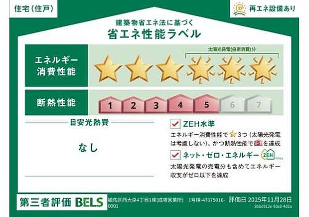 - 星マークの数が多いほどエネルギー消費性能が高いことを示しています。再エネ設備のない住宅は★0~★4の5段階評価、再エネ設備がある住宅は★0~★6の7段階評価となります。