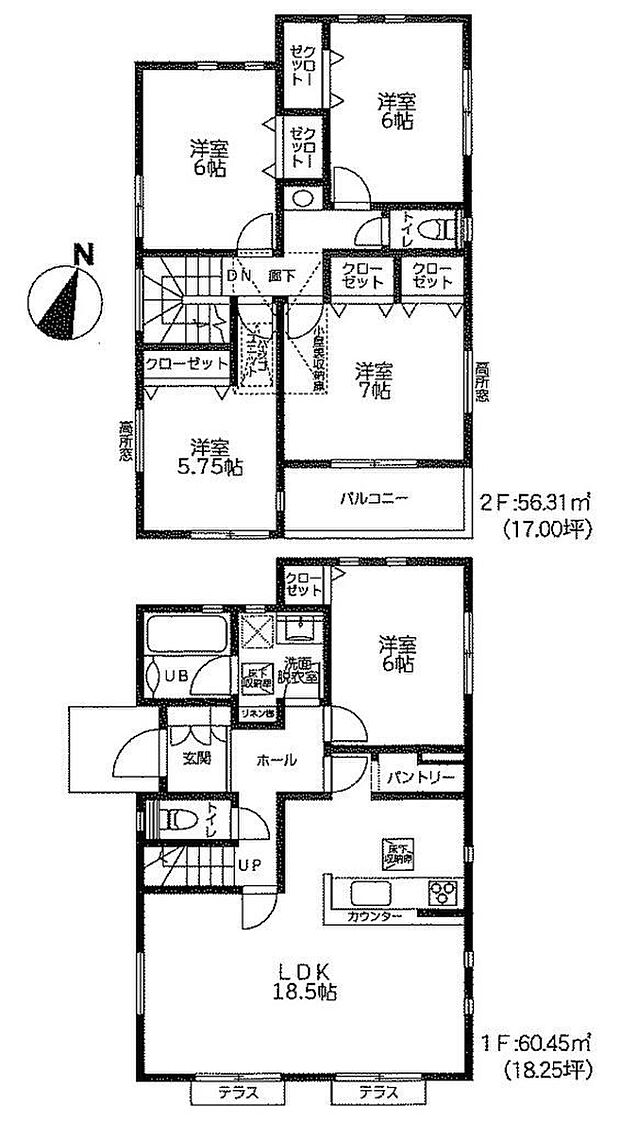 | 間取り | 5LDK(小屋裏収納庫付き) 間取り内訳:洋室 6帖(1階)・リビングダイニングキッチン 18.5帖(1階)・洋室 7帖(2階)・洋室 6帖(2階)・洋室 6帖(2階)・洋室 5.7帖(2階) |
