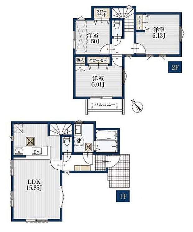 | 間取り | 3LDK 間取り内訳:リビングダイニングキッチン 15.8帖(1階)・洋室 6.1帖(2階)・洋室 4.6帖(2階)・洋室 6帖(2階) |