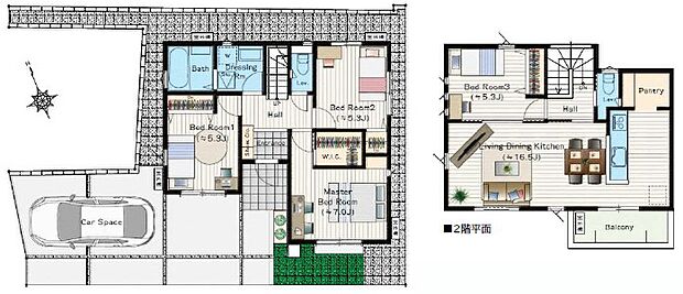 間取り内訳:洋室 7帖(1階)・洋室 5.3帖(1階)x2・リビングダイニングキッチン 16.5帖(2階)・洋室 5.3帖(2階)