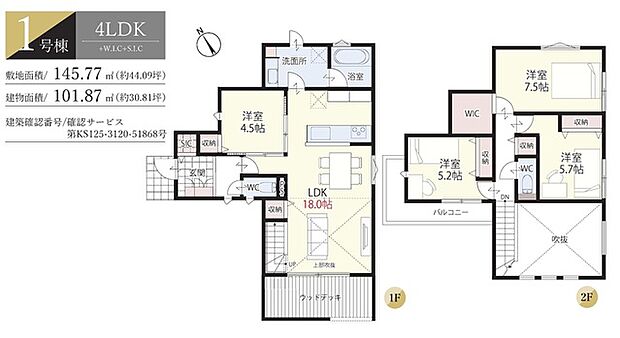 間取り内訳:リビングダイニングキッチン 18帖・洋室 7.5帖・洋室 5.7帖・洋室 5.2帖・洋室 4.5帖
