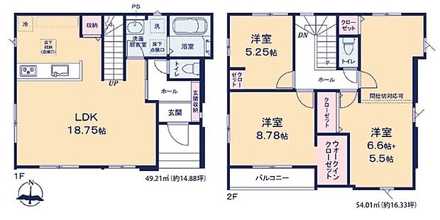 | 間取り | 3LDK(間仕切り対応可能) 間取り内訳:リビングダイニングキッチン 18.7帖・洋室 8.7帖・洋室 12.1帖・洋室 5.2帖 |