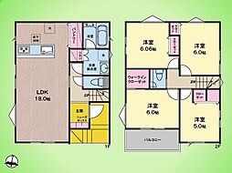 間取り内訳:リビングダイニングキッチン 18.7帖(1階)・洋室 5.2帖(2階)・洋室 6帖(2階)・洋室 6.1帖(2階)・洋室 5.2帖(2階)