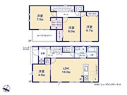 | 間取り | 3SLDK(3SLDK+ウォークインクローゼット) 間取り内訳:リビングダイニングキッチン 16帖(1階)・収納 5帖(1階)・洋室 7.1帖(2階)・洋室 6.5帖(2階)・洋室 5.2帖(2階) |