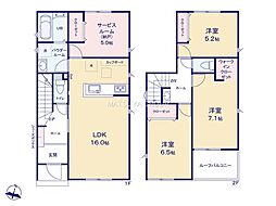 | 間取り | 3SLDK(3SLDK+ウォークインクローゼット) 間取り内訳:リビングダイニングキッチン 16帖(1階)・収納 5帖(1階)・洋室 7.1帖(2階)・洋室 6.5帖(2階)・洋室 5.2帖(2階) |