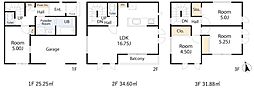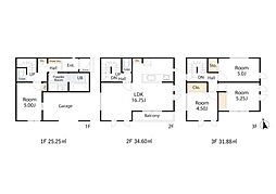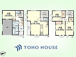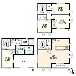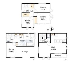 間取り内訳:洋室 5帖(1階)・リビングダイニングキッチン 16.7帖(2階)・洋室 4.5帖(3階)・洋室 5.2帖(3階)・洋室 5帖(3階)