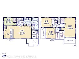 間取り内訳:リビングダイニングキッチン 16.5帖(1階)・洋室 7帖(2階)・洋室 6帖(2階)・洋室 6帖(2階)・洋室 5帖(2階)