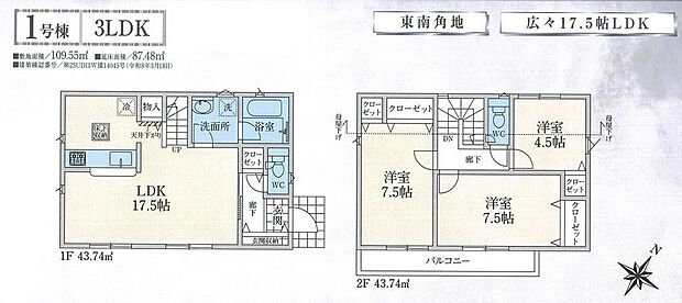 | 間取り | 3LDK 間取り内訳:リビングダイニングキッチン 17.5帖(1階)・洋室 4.5帖(2階)・洋室 7.5帖(2階)x2 |