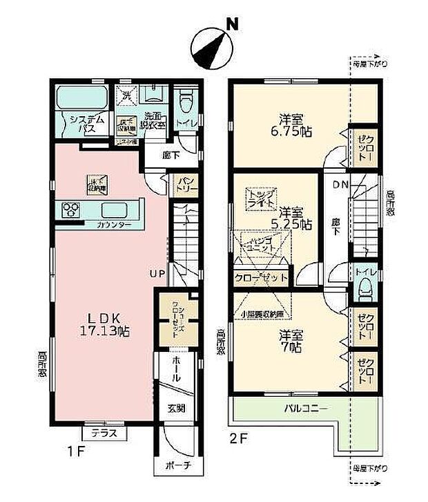 間取り内訳:リビングダイニングキッチン 17.1帖(1階)・洋室 6.7帖(2階)・洋室 5.2帖(2階)・洋室 7帖(2階)