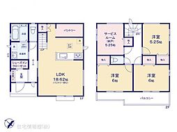 | 間取り | 3SLDK 間取り内訳:リビングダイニングキッチン 18.6帖(1階)・洋室 6帖(2階)x2・洋室 5.2帖(2階)・収納 5.2帖(2階) |