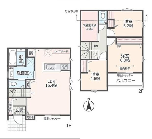 | 間取り | 3LDK 間取り内訳:リビングダイニングキッチン 16.4帖(1階)・洋室 5.2帖(2階)・洋室 6.8帖(2階)・洋室 4.6帖(2階) |