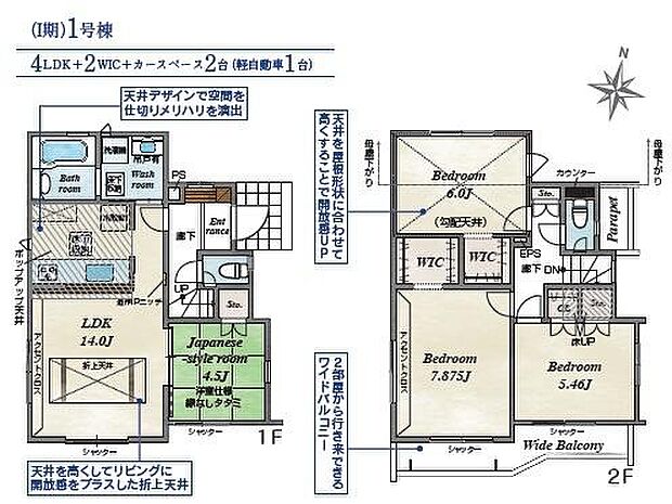 間取り内訳:リビングダイニングキッチン 14帖(1階)・和室 4.5畳(1階)・洋室 6帖(2階)・洋室 5.4帖(2階)・洋室 7.8帖(2階)