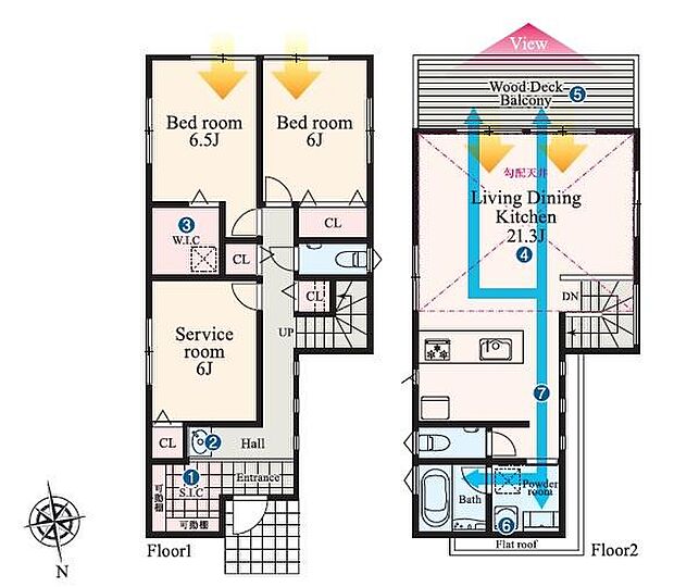間取り内訳:洋室 6.5帖(1階)・洋室 6帖(1階)・収納 6帖(1階)・リビングダイニングキッチン 21.3帖(2階)