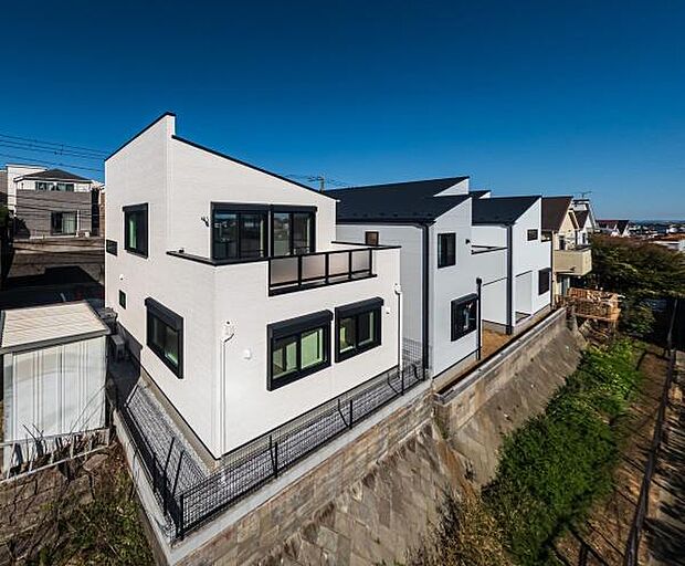 • 青空に映えるモダンな造形。高台の開放感と、プライバシーに配慮したスタイリッシュな外観が、住まう誇りを満たします。