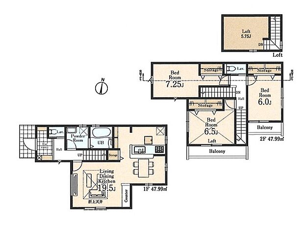 6m公道面、全居室南向き、陽当たり良好。LDL19.5帖、パントリーあり。Wバルコニー。全居室収納あり。固定階段付ロフト。閑静な住宅街。駐車3台可(車種による)。コンビニまで徒歩4分。