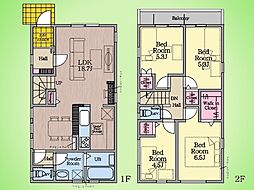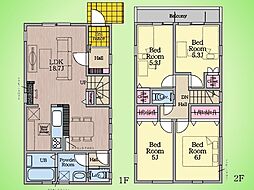 | 間取り | 4LDK 間取り内訳:リビングダイニングキッチン 18.7帖(1階)・洋室 5帖(2階)・洋室 5.3帖(2階)・洋室 5.3帖(2階)・洋室 6帖(2階) |