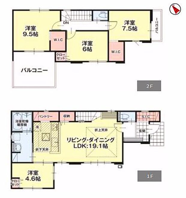 | 間取り | 4LDK 間取り内訳:リビングダイニングキッチン 19.1帖(1階)・洋室 4.6帖(1階)・洋室 9.5帖(2階)・洋室 7.5帖(2階)・洋室 6帖(2階) |