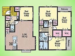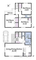| 間取り | 3SLDK 間取り内訳:リビングダイニングキッチン 16.9帖(1階)・洋室 5帖(1階)・洋室 7.1帖(2階)・収納 4.9帖(2階)・洋室 7.5帖(2階) |