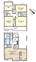 | 間取り | 4LDK 間取り内訳:リビングダイニングキッチン 16帖(1階)・洋室 4.5帖(1階)・洋室 7.5帖(2階)・洋室 5.7帖(2階)・洋室 5.7帖(2階) |
