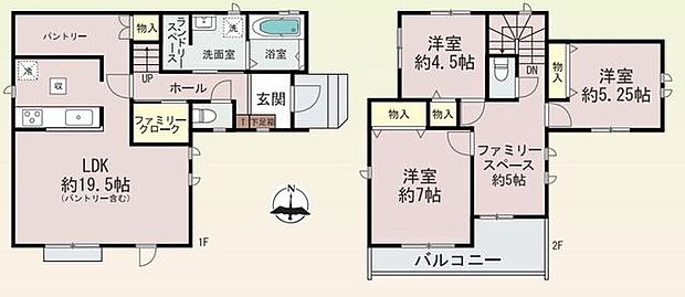 | 間取り | 3LDK(2Fファミリースペース5.0畳) 間取り内訳:リビングダイニングキッチン 19.5帖(1階)・洋室 4.5帖(2階)・洋室 5.2帖(2階)・洋室 7帖(2階) |