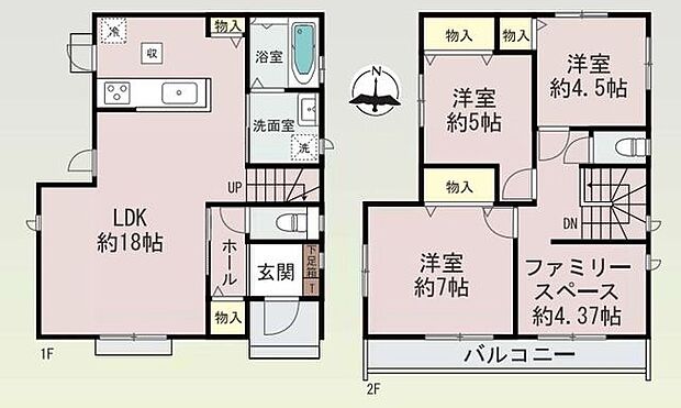 | 間取り | 3LDK(2Fファミリースペース4.3畳) 間取り内訳:リビングダイニングキッチン 18帖(1階)・洋室 4.5帖(2階)・洋室 5帖(2階)・洋室 7帖(2階) |