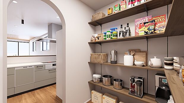 • 【パントリーで収納たっぷり。家事室としてのアレンジも可能!】キッチンの後ろには約2帖のパントリーを設置。食料品や生活用品のストックなどを収納できます。自分好みにアレンジして、料理の合間に一息つけるワークスペースや趣味用の書斎にすることも可能です。