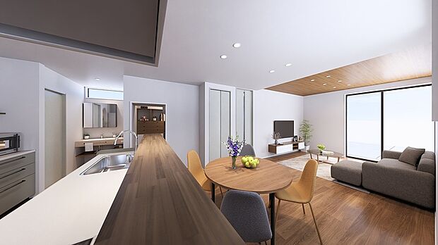 • 【パントリーで収納たっぷり。家事室としてのアレンジも可能!】キッチンの後ろには約2帖のパントリーを設置。食料品や生活用品のストックなどを収納できます。自分好みにアレンジして、料理の合間に一息つけるワークスペースや趣味用の書斎にすることも可能です。