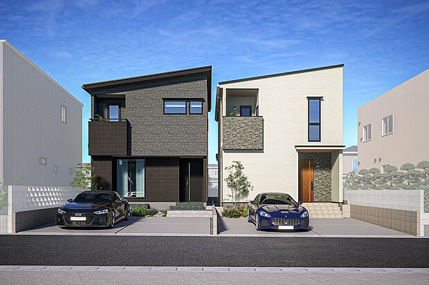 • 【外観完成予想図】T-2、T-1/名鉄「一ツ木」駅徒歩8分、公園も近い閑静な街。商業施設が身近に揃う利便性と、太陽光発電を備えた高断熱なZEH仕様が魅力です。家計と環境に優しく、心豊かな暮らしを叶える住まいです。