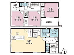 | 間取り | 3LDK 間取り内訳:リビングダイニングキッチン 16.6帖(1階)・和室 3畳(1階)・洋室 6.7帖(2階)x2・洋室 5帖(2階) |