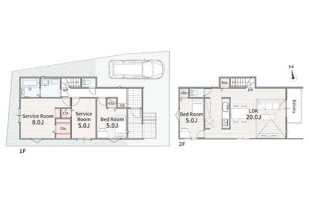 | 間取り | 2SLDK 間取り内訳:収納 8帖(1階)・収納 5帖(1階)・洋室 5帖(1階)・洋室 5帖(2階)・リビングダイニングキッチン 20帖(2階) |