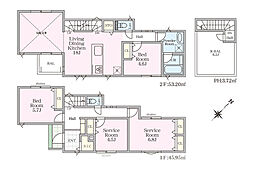 | 間取り | 2SLDK 間取り内訳:収納 8帖(1階)・収納 5帖(1階)・洋室 5帖(1階)・洋室 5帖(2階)・リビングダイニングキッチン 20帖(2階) |